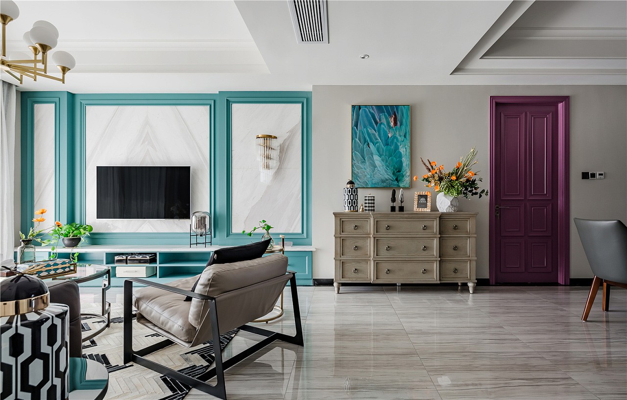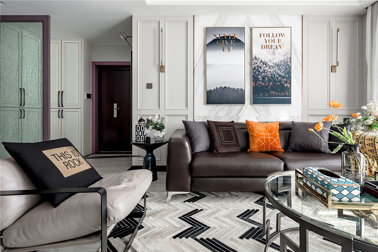 入戶門廳以白色作為基調,紫色門套作為點綴,整體空間驚艷脫俗。地板選用更易清洗、更耐磨損的全瓷磚鋪設,大理石貼墻與地面一起,把客餐廳的整體基調定在了一個雅字上,典雅大氣。深色的皮質沙發把整個客廳的冷色調提了起來,像一杯香醇的咖啡,迅速捂暖了大理石的冷硬。主臥室淺棕色、黑色、紫色、白色,四大色塊干凈利落的劃分出主臥的空間層次,床頭細節的處理使空間更有縱深感。主衛生間銀白龍和爵士白的采用與客廳的整體色調一脈相承,三種切割成不同大小的瓷磚拼接造型,使小小一方天地也能層次分明。
