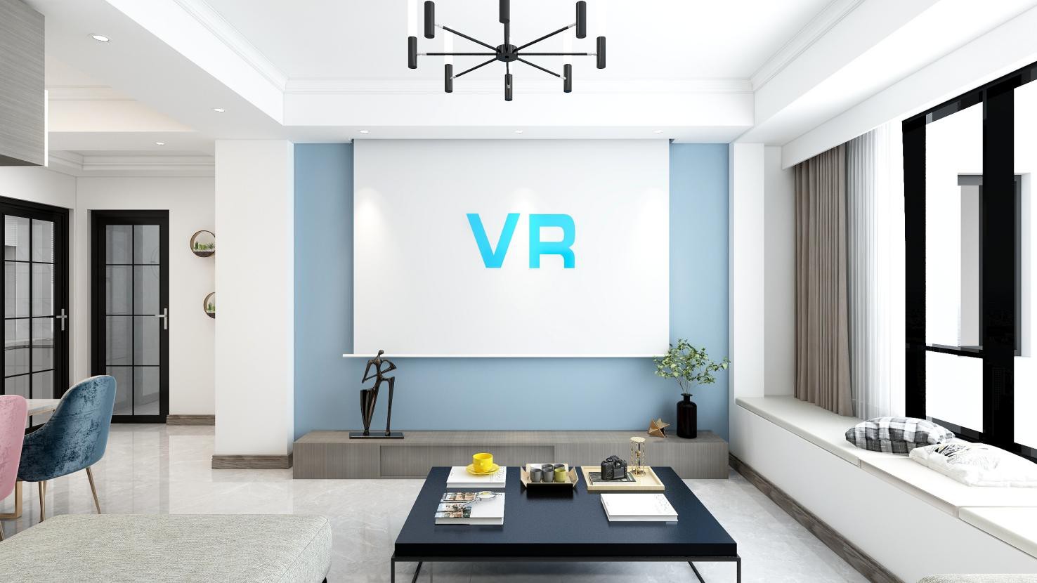 電視背景墻以少即是多的態度為室內塑造更多的想象空間,大面積留白的思路結合跳脫的藍色色點綴呼應,回歸到電視墻本質把視覺更多留在電視。